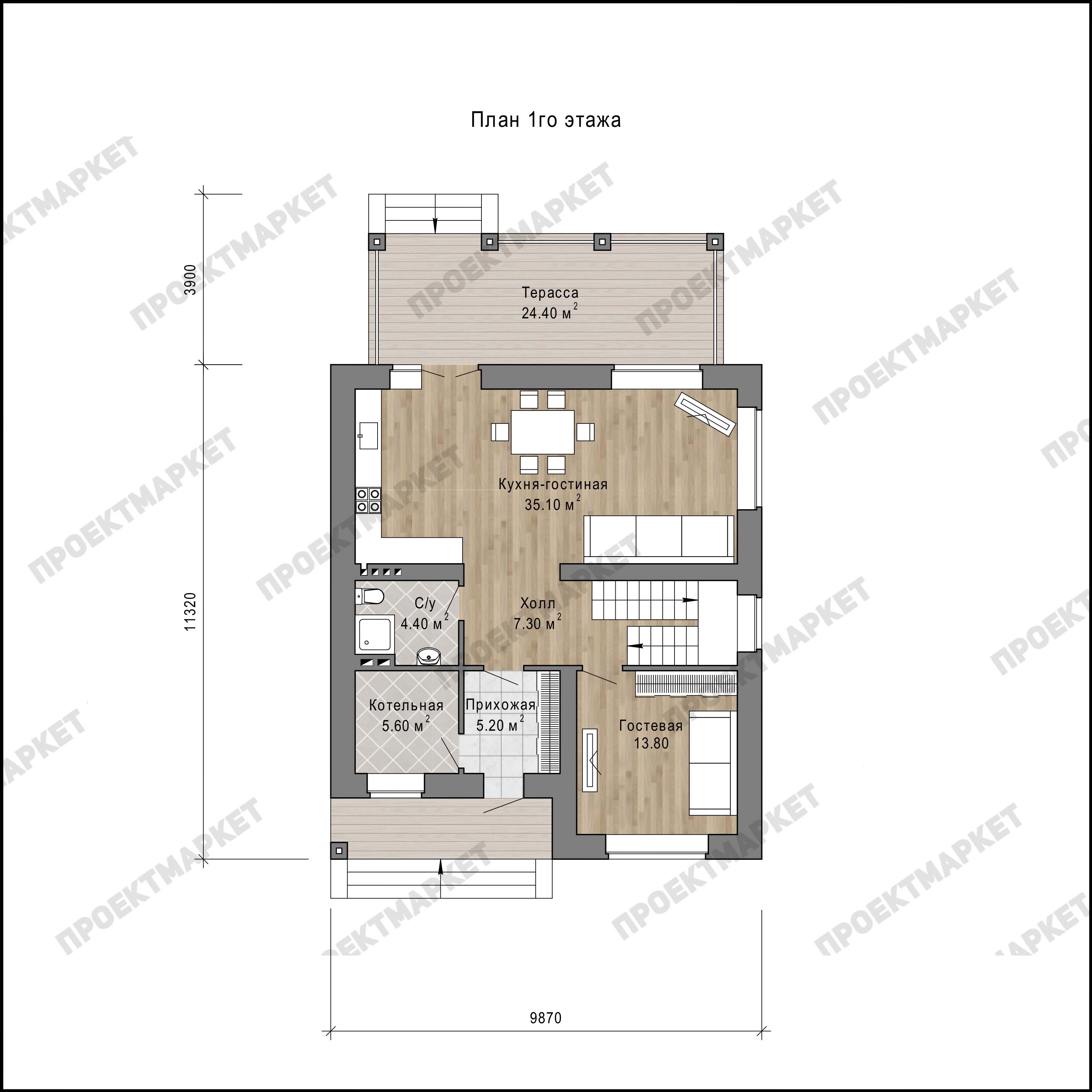 Продуманный проект дома придает ему в итоге оригинальность. Например, просторная и красивая терраса служит местом для приемов, демонстрируя уют вашего жилища. При проектировании разработчики применили весь свой архитектурно-строительный опыт, чтобы ваш загородный дом прослужил долго.